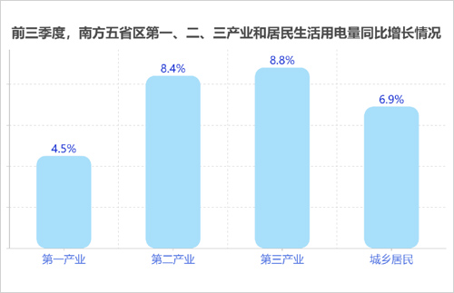 来源:南网50Hz前三季度,广东、广西、云南、贵州、海南五省区全社会用电量12786亿千瓦时,同比增长8.1%,增速高于全国0.2个百分点,较去年同期提高1.8个百分点。多项电力指标向好,体现经济运行稳中有进,向好因素累积增多。第二产业成为电量增长主力军分省区看前三季度,广东全社会用电量6904亿千瓦时,用电量规模保持排名全国第一,用电量增速7.8%,在五省区排名第三;云南用电量同比增长11.8%,增速位居五省区首位。分产业看前三季度,第一、二、三产业和居民生活用电同比分别增...